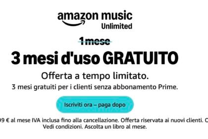 Amazon regala per tre mesi l’abbonamento ad Amazon Music Unlimited. È il servizio di streaming musicale in abbonamento di Amazon. Offre l’accesso on-demand a decine di milioni di brani senza pub...