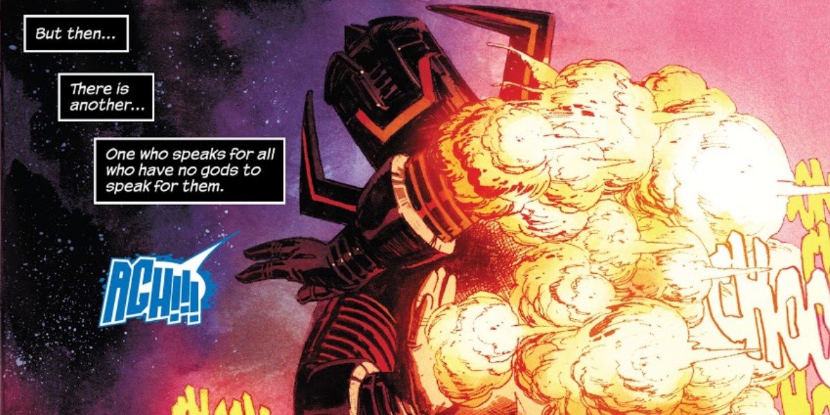 Dopo aver preso l’energia dal primo pianeta, Galactus sembra essere intenzionato ad abbattere la sua forza su Thor, ma qui interviene il suo vecchio amico, Beta Ray Bill. Quello che trova è però un eroe cambiato e desideroso di parlare faccia a faccia con il nemico. Per farlo è disposto a passare su Thor senza alcuna pietà. Con grande sorpresa per tutti noi, l’eroe arriva insieme alla sua nave Skuttlebutt, che non dovrebbe più esistere.