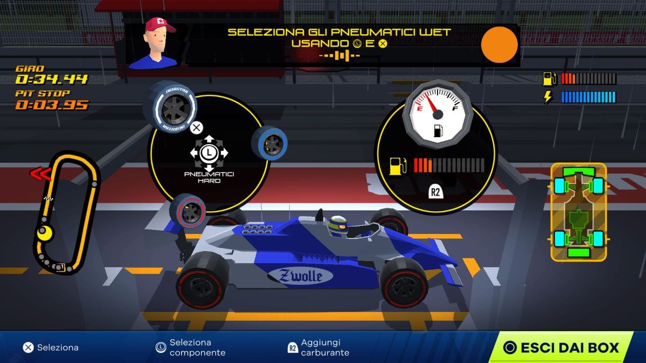A ogni inizio gara ci sarà la strategia dei box su cui possiamo scegliere quali gomme montare e quante soste effettuare. L’entrata ai box permette tramite la selezione dello stick la scelta dei pneumatici da adottare e quanta benzina effettuare, una volta fatto bisognerà poi premere un tasto per uscire dai box. Bisogna essere davvero veloci per poter rientrare in pista e recuperare terreno. C’è un pò quel brivido di essere veramente veloci a fare il tutto.