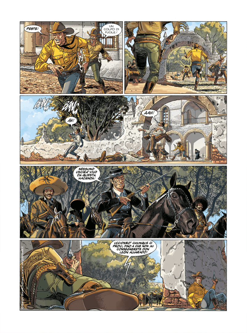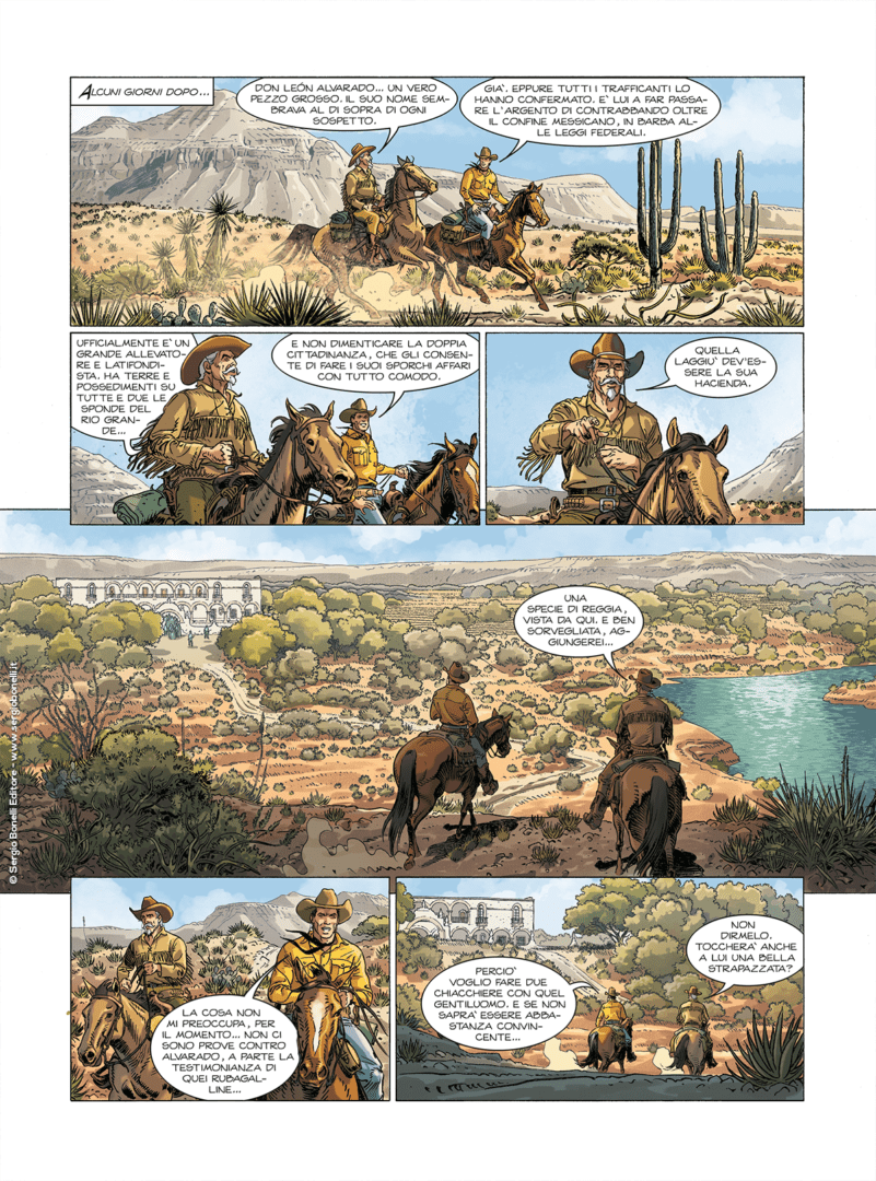 Dall’altra parte abbiamo Tex e il suo pard Kit Carson diretti verso un gruppo di uomini che trasportano dell’argento ottenuto in modo illegale. Tutte le tracce porteranno i due ranger in una hacienda gestita dall’uomo dal pugno di ferro, Alvarado, di cui però vedono solamente il funerale. La figlia, Blanca, appare come una donna forte, nonostante un’apparenza angelica e debole. Nello stesso istante arriva però anche Diego Portela, pronto a scatenare la propria vendetta contro una famiglia in lutto.